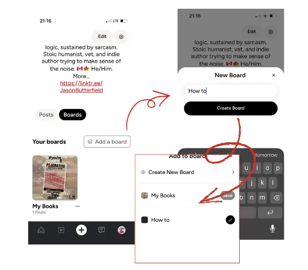 Boards allow you to group related posts into themed collections. Think of them as curated shelves inside your profile.