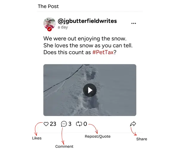 - Share – Sends or distributes the post externally.