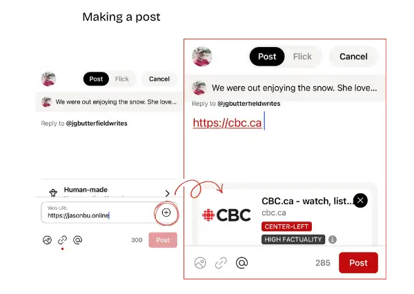 When composing a post, you can paste a URL directly into the text field or use the link icon. When you paste the link directly into the body of the post it counts towards your 300 characters, so keep that in mind. It also does not get processed through mediafactcheck.com and given a rating.
